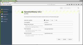 DynamicHistory är ett tillägg för Firefox som automatiskt tar bort webbläsarens historik baserat på specifika webbplatser och sidinnehåll. Med denna programvara kan användare ställa in filter som tar bort historik för sidor som innehåller vissa ord, till exempel 'bad-history'. När en sida inte sparas i historiken, får den en röd kant och fliken markeras tydligt, vilket gör det lätt att se vilka sidor som inte spåras. Användarna kan justera sina filter och inställningar direkt i tilläggspreferenserna.